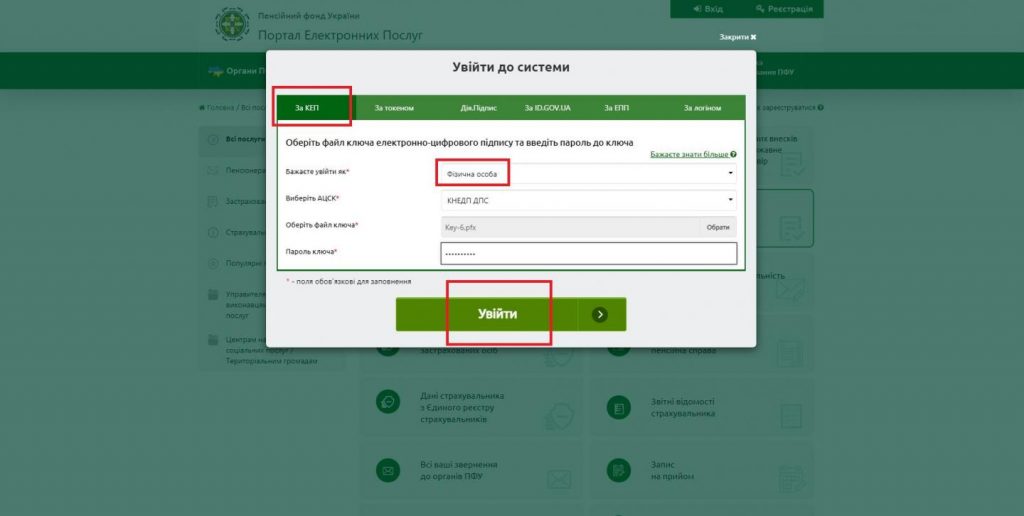 На вебпорталі Пенсійного фонду України (https://portal.pfu.gov.ua) авторизуйтесь за допомогою кваліфікованого електронного підпису (КЕП) та натисніть кнопку “Увійти”.