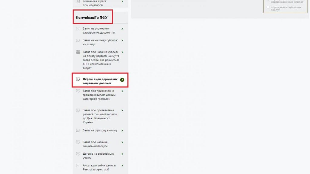 В особистому кабінеті на панелі ліворуч у розділі “Комунікації з ПФУ” оберіть опцію “Окремі види державних соціальних допомог”.