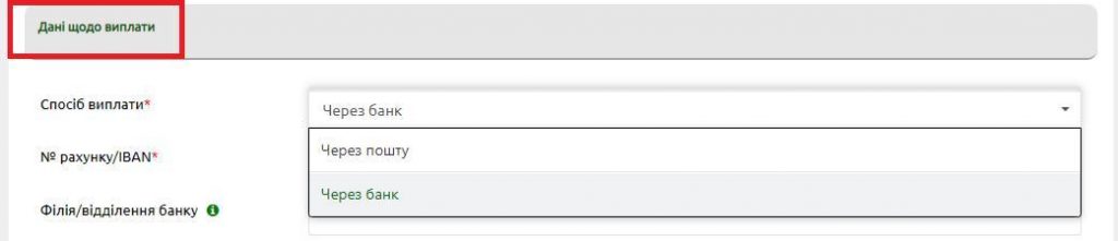 У полі онлайн-форми “Дані щодо виплати” оберіть спосіб виплати (через пошту, або через банк), та внесіть необхідні дані / реквізити.