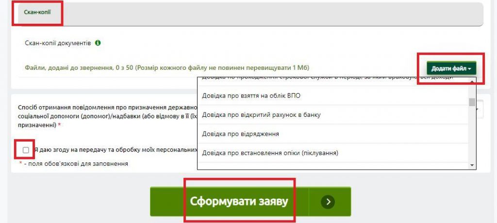 За потреби додайте копії сканованих документів, перелік яких зазначено у випадаючому меню, зазначте спосіб отримання повідомлення про призначення державної соціальної допомоги (допомог) або надбавки та надайте згоду на обробку персональних даних.
