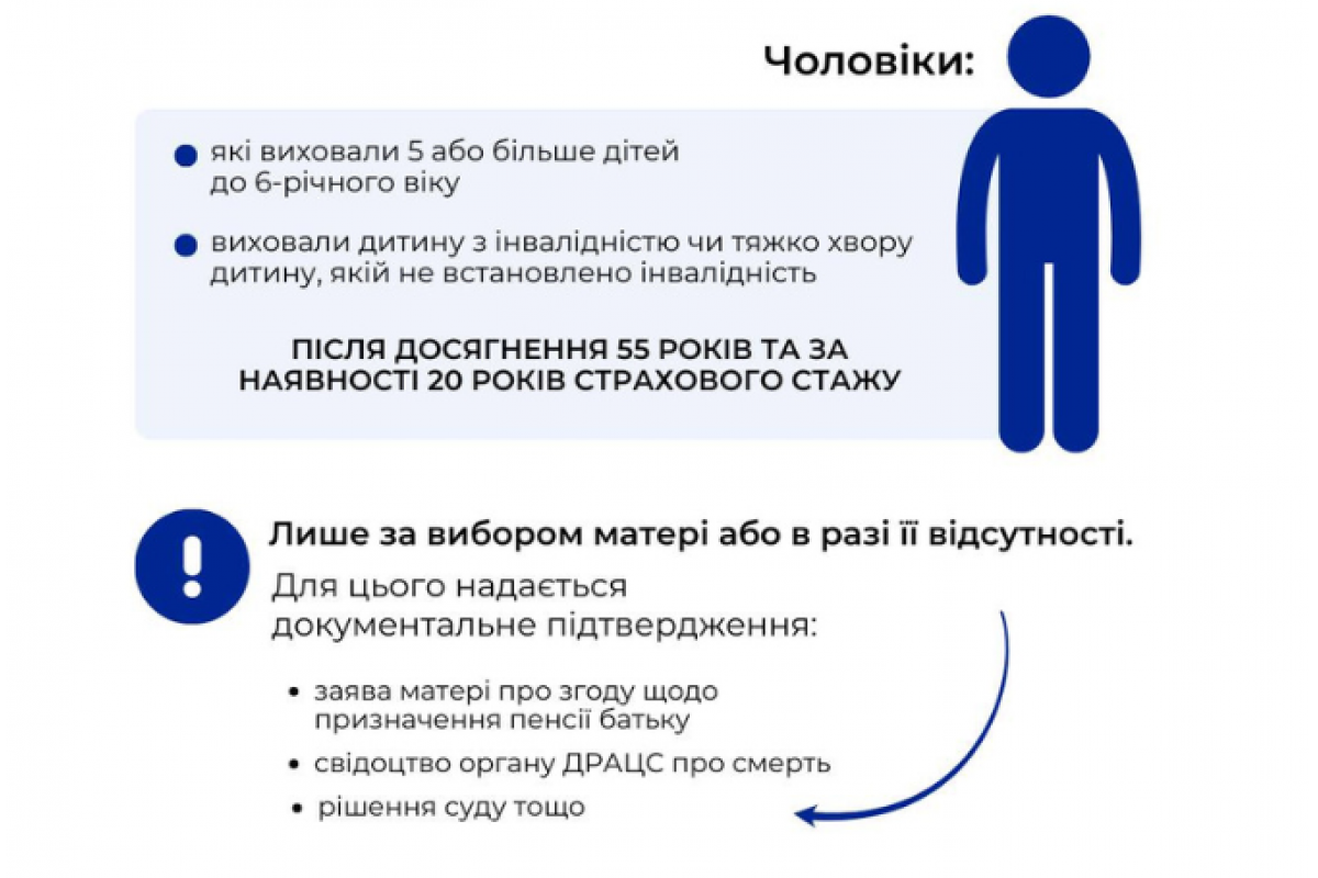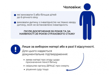 Дострокова пенсія для жінок передбачена з 50 років за наявності щонайменше 15 років страхового стажу; для чоловіків – з 55 років за умови не менше 20 років стажу.